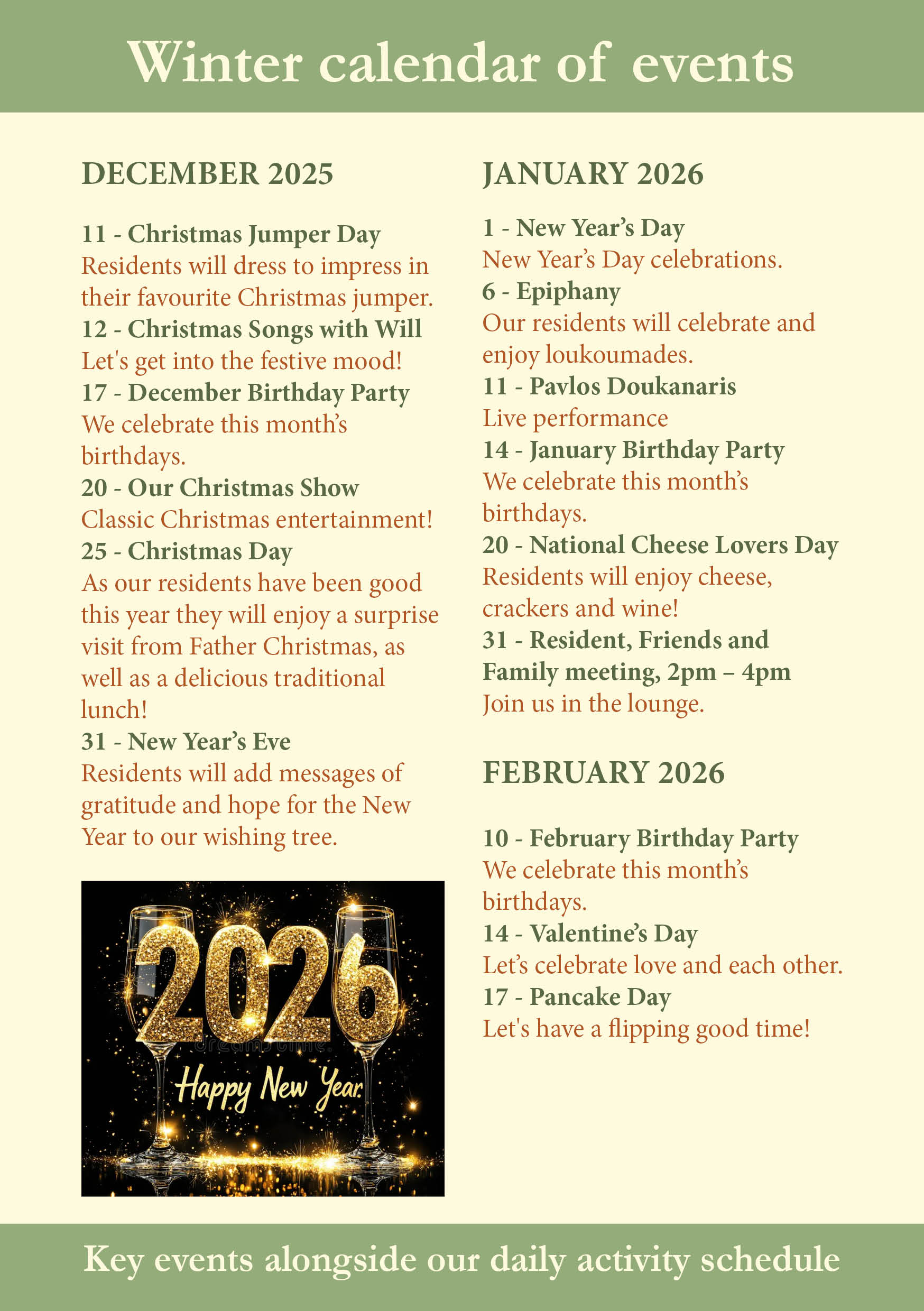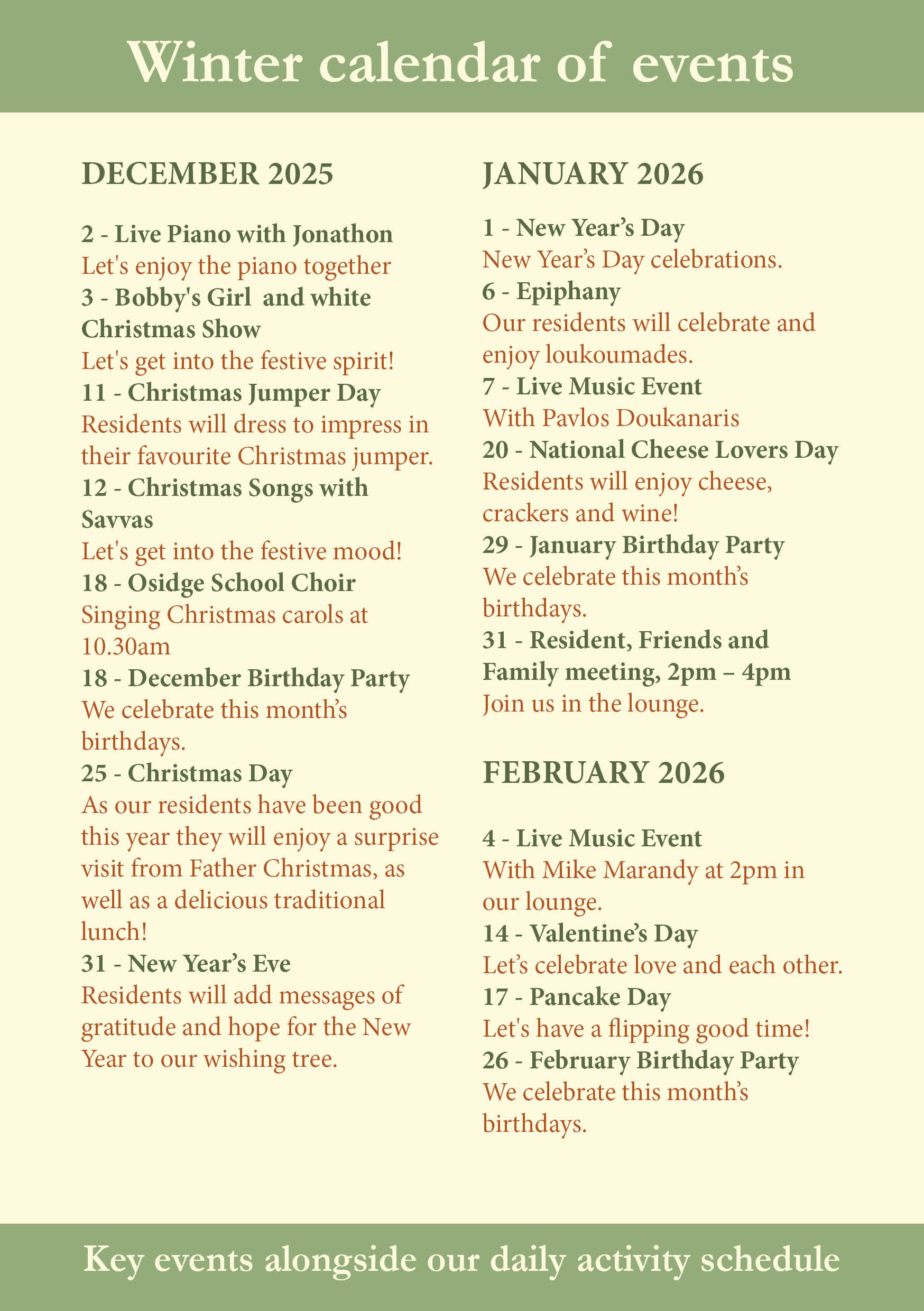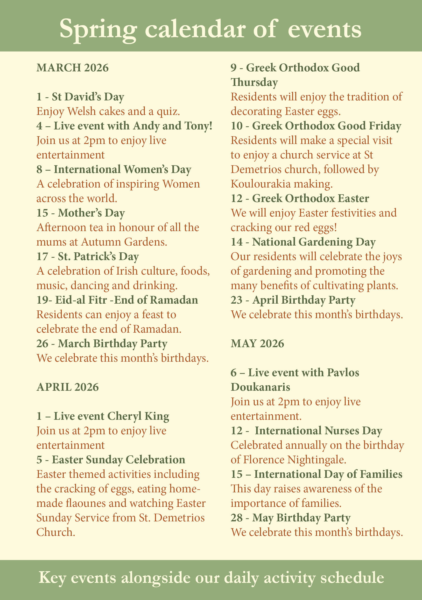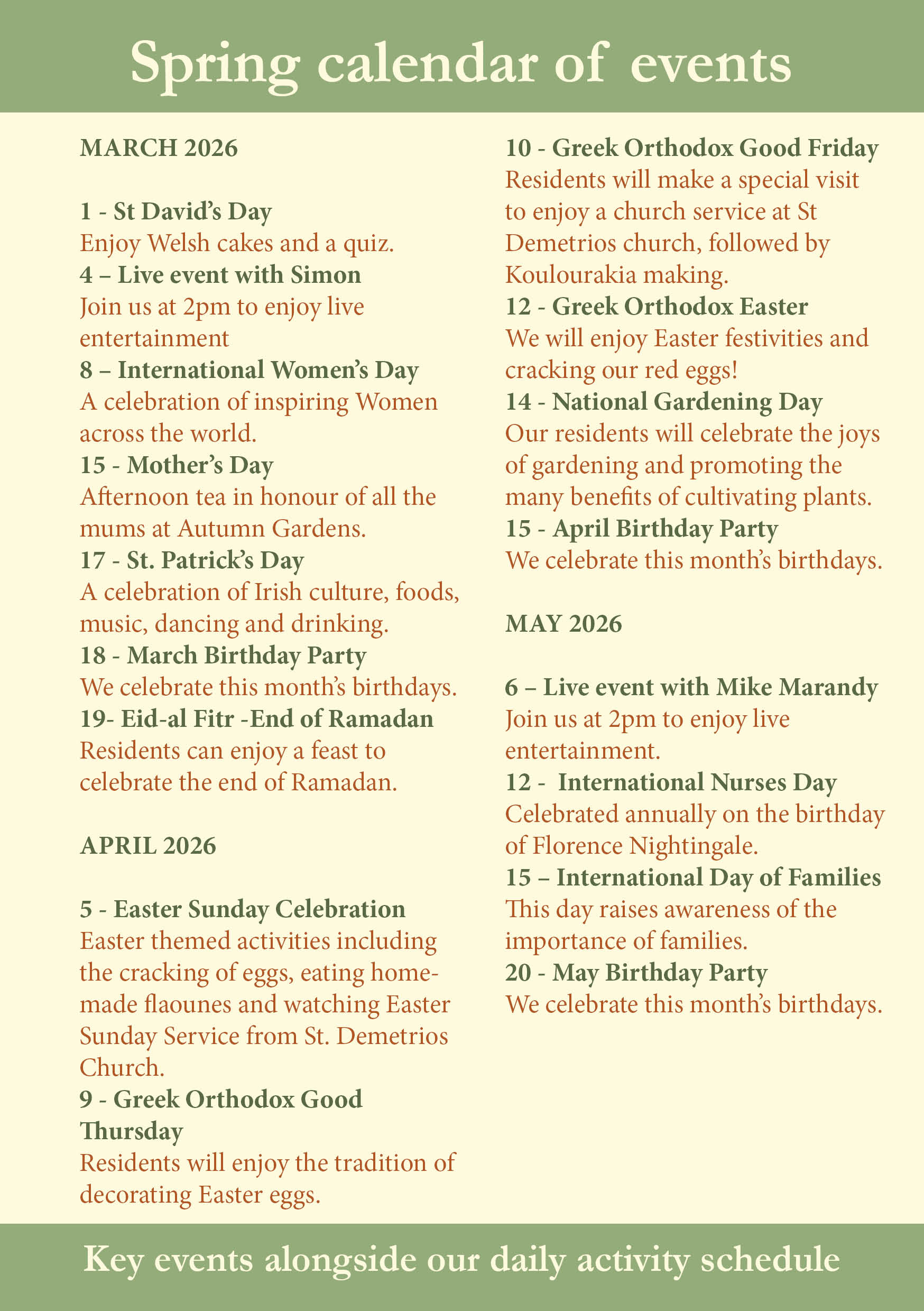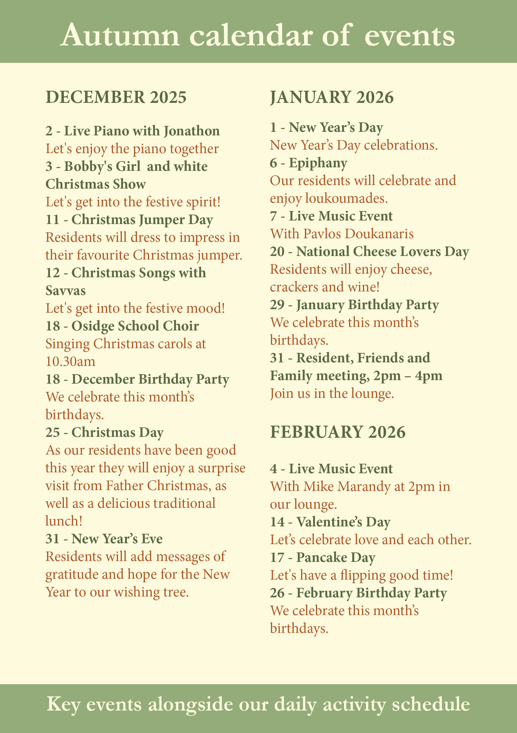 Our activities are a perfect opportunity for residents to make friends within our homes and for family to visit and enjoy quality time with their loved one. Find out what special events are happening at our homes below.